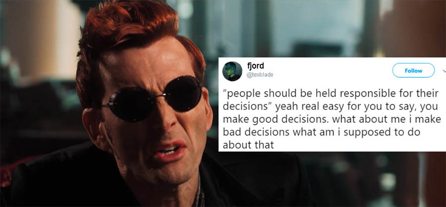 Canon: good omens Age: 6000+ years old Housing: he's in ADI housing with Aziraphale (👀) Entity Affiliation(s): web, he's not feeding it yet but he'll get there Permissions: HERE